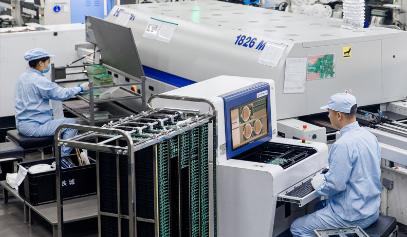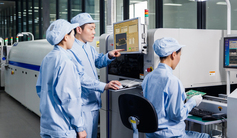 SMT車間已建成4條YAMAHA全自動貼片線。測試過程采用自動光學(xué)檢測設(shè)備、錫膏檢測儀、Chroma可編程檢測系統(tǒng),ICT在線測試儀,全自動流水式封閉老化室等11道測試門。裝配車間采用自動焊接機器人、自動鎖螺絲機器人、鐳射激光設(shè)備、MES物聯(lián)系統(tǒng)組成的全自動化流水線。